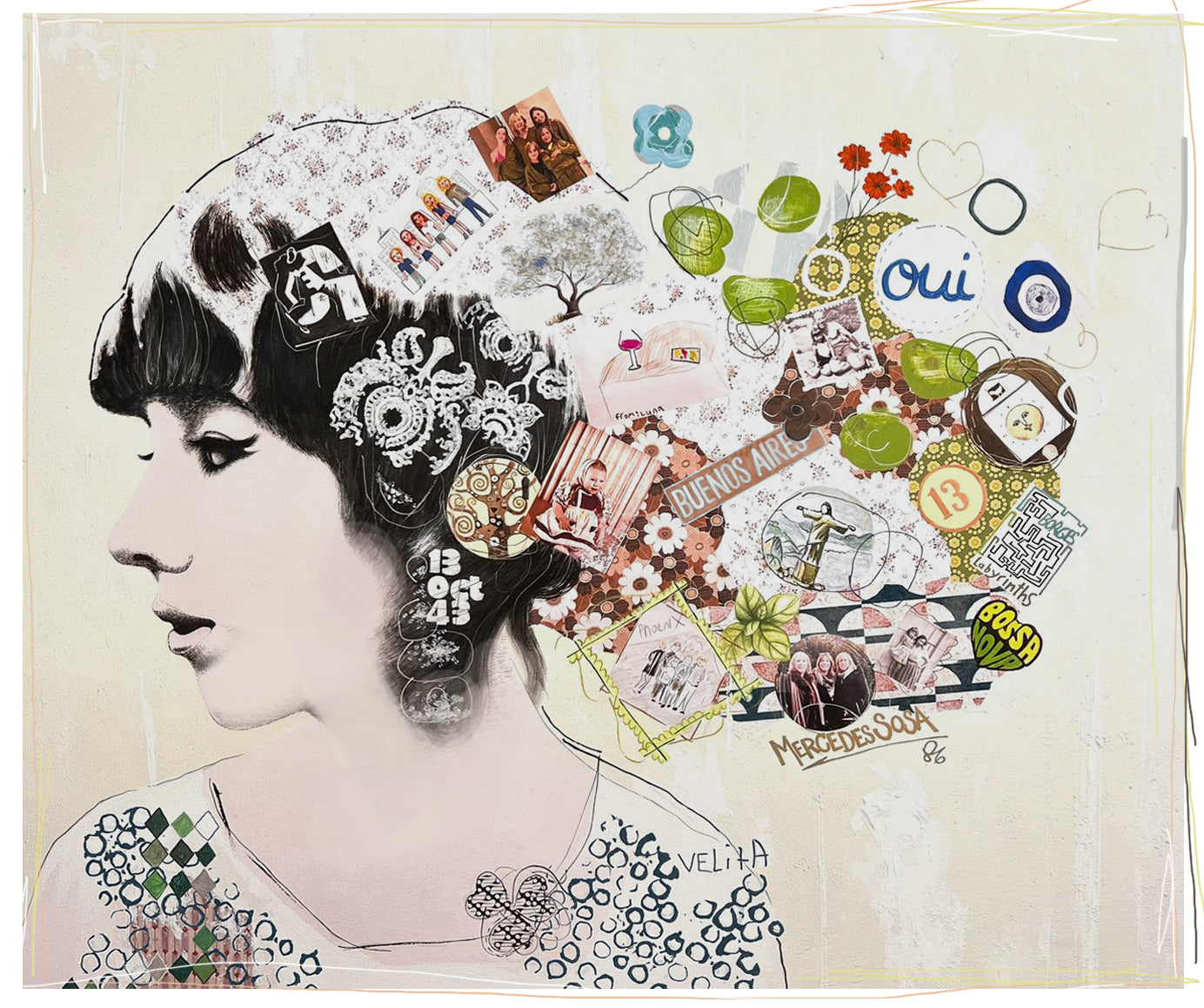 - Limited-edition prints, each uniquely enriched with hand-painted accents and paper patterns from Irene’s originals.